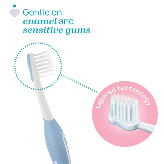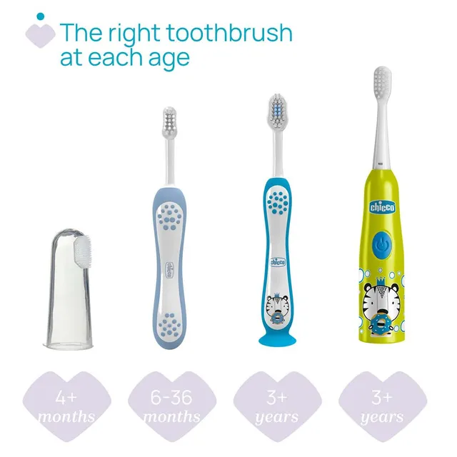 فرشاة أسنان تشيكو مثالية لتنظيف الأسنان واللثة الحساسة منذ بزوغ أول سنّ لبني، بفضل شعيراتها الناعمة للغاية. نظافة الأسنان اليومية عادة جيدة يُنصح بتعليمها حتى للأطفال الصغار. الأهم هو منع تراكم البكتيريا، والأهم من ذلك، إتقان الحركات الصغيرة التي تصبح عادة صحية لدى البالغين.