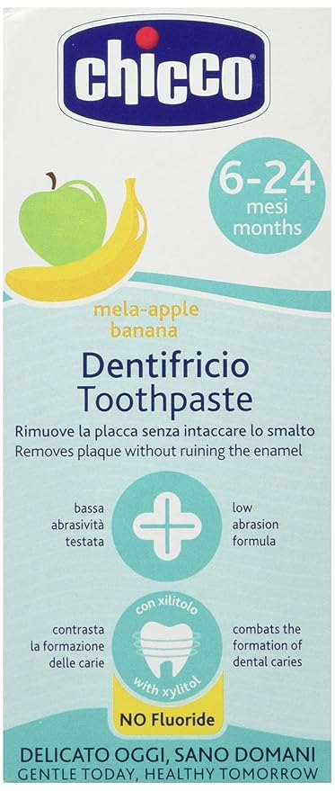Chicco Toothpaste Apple Banana is specially formulated for babies aged 6 months and older. It provides a gentle and effective way to care for your baby's first teeth and gums.
