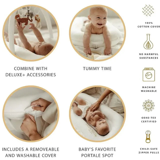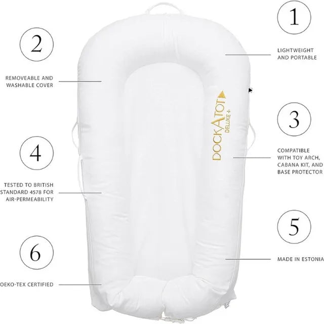 The DockATot Deluxe+ dock is an award-winning multifunctional docking station for babies 0-8+ months old. The Deluxe+ dock is the ideal spot for babies for supervised lounging, playing, resting, cuddling, diaper changes and tummy time. Created to mimic the womb and voted as a must-have baby product from parents around the world, it can be used around the house and is ideal for travel. The Deluxe+ dock adheres to strict standards to ensure a safe environment for little ones. Made in Europe. Features include air permeability and Oeko-Tex Standard 100 Class 1 certification (testing for harmful substances).