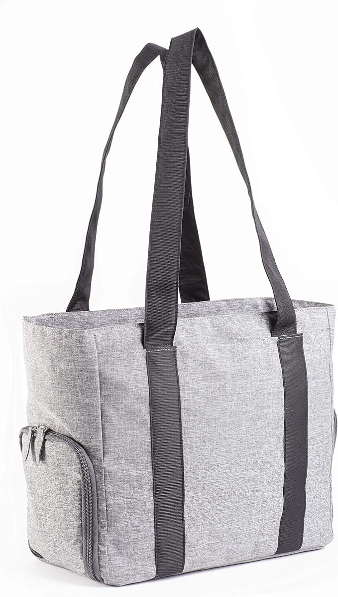 The Breast Pump Carryall Tote Bag fits most electric pumps and has the pockets to organize everything. Use it as a pump bag, a diaper bag, or even a yoga bag! Choose from two classy color schemes: heather gray with black trim or modern black with leather-like trim. Match any season, situation, and look!
