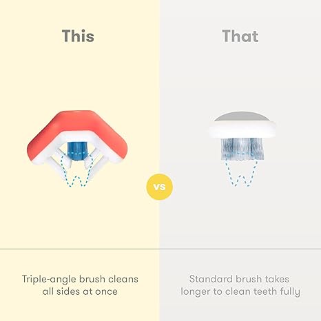 Brushing a toddler’s teeth can feel like a battle. The Triple-Angle Toothhugger makes quick work of cleaning small teeth, thanks to its 3-sided brush head which brushes all sides of the teeth in one go. With super-soft, gentle bristles that change color to let you know when it’s time to replace, the Toothhugger helps kids learn and practice good oral hygiene at an early age.