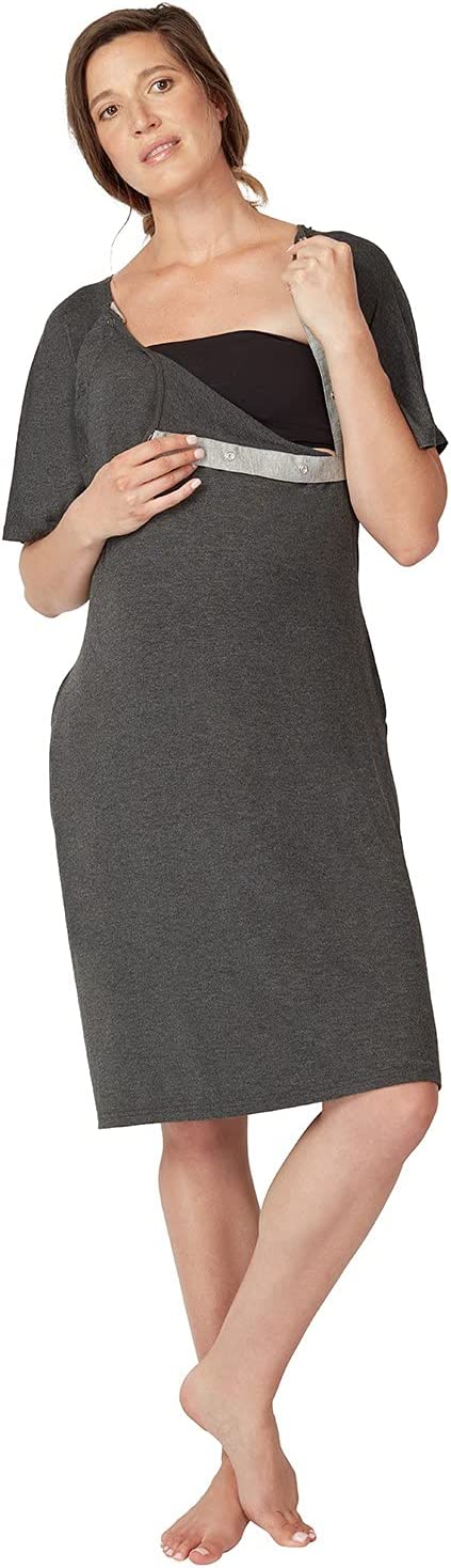 The softness of your favorite t-shirt meets smart-access snaps for skin-to-skin closeness and nursing, and a rear closure that wont leave you flapping in the wind. Designed to look and feel better, from the first contractions to the very first pictures.