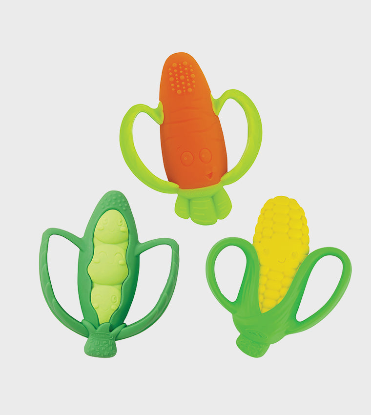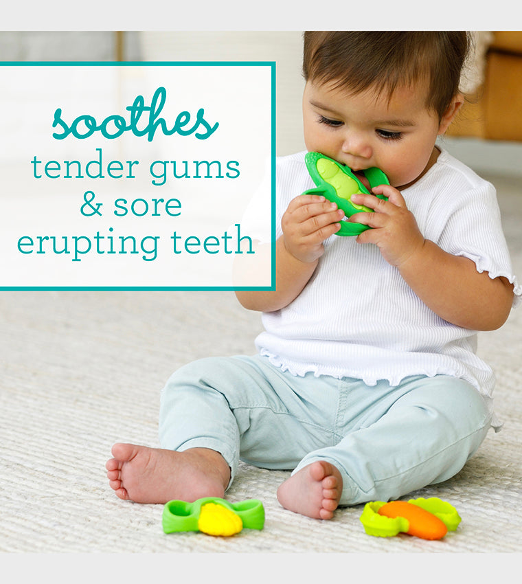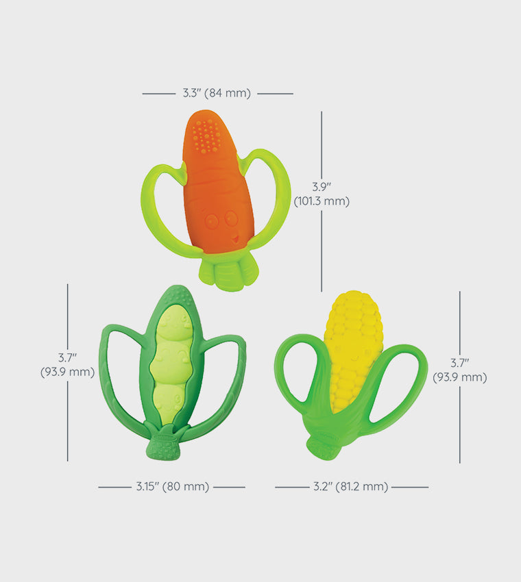 Babies will go gaga for the Infantino Farmers Market Teether Gift Set. This colorful set includes three BPA-free silicone teethers. This multi-textured set is perfect for soothing tender gums and sore erupting teeth. These colorful, food-inspired teethers have two easy-to-grasp handles perfectly sized for little hands to hold. A variety of “flavors” including peas, carrot, and corn make a great introduction to healthy foods.