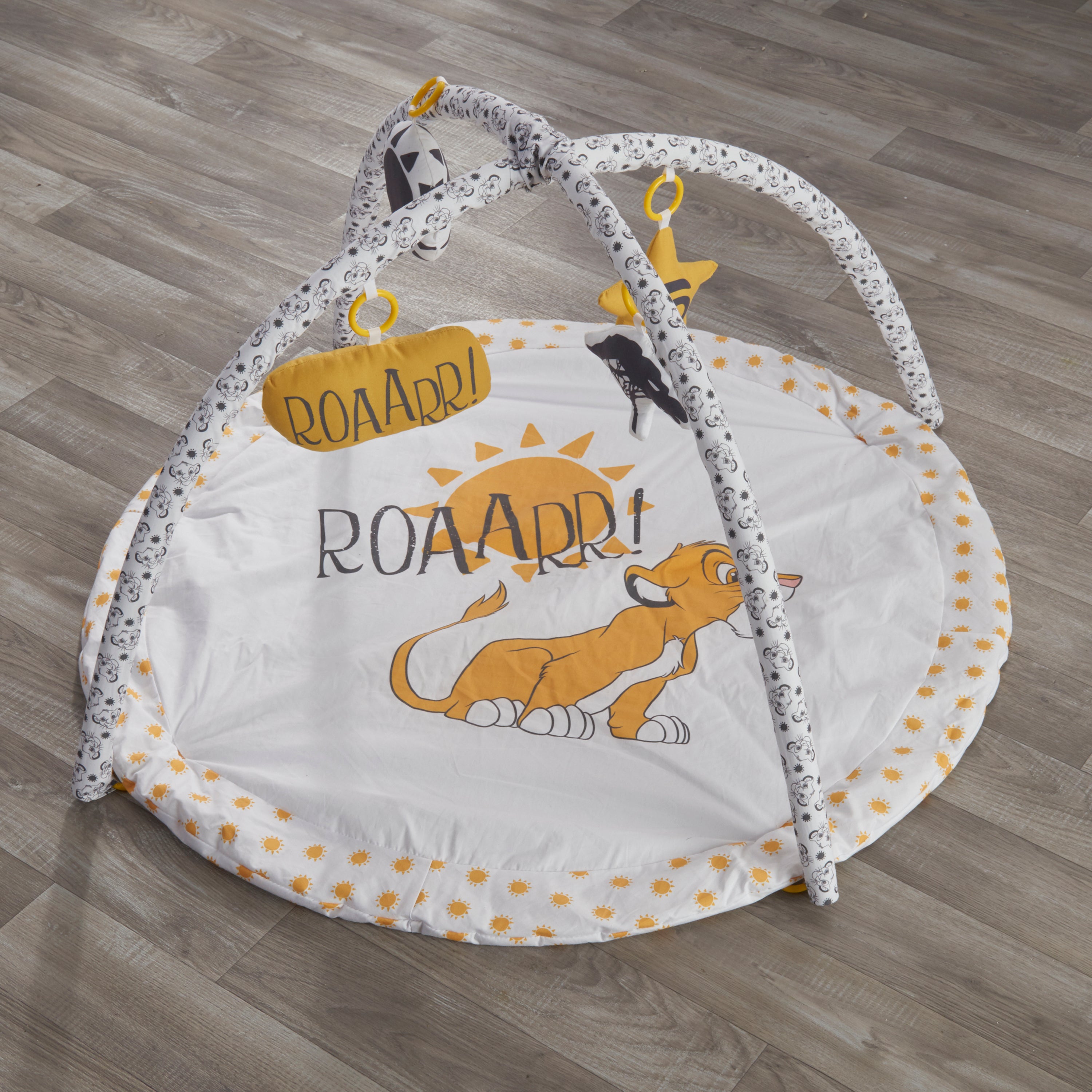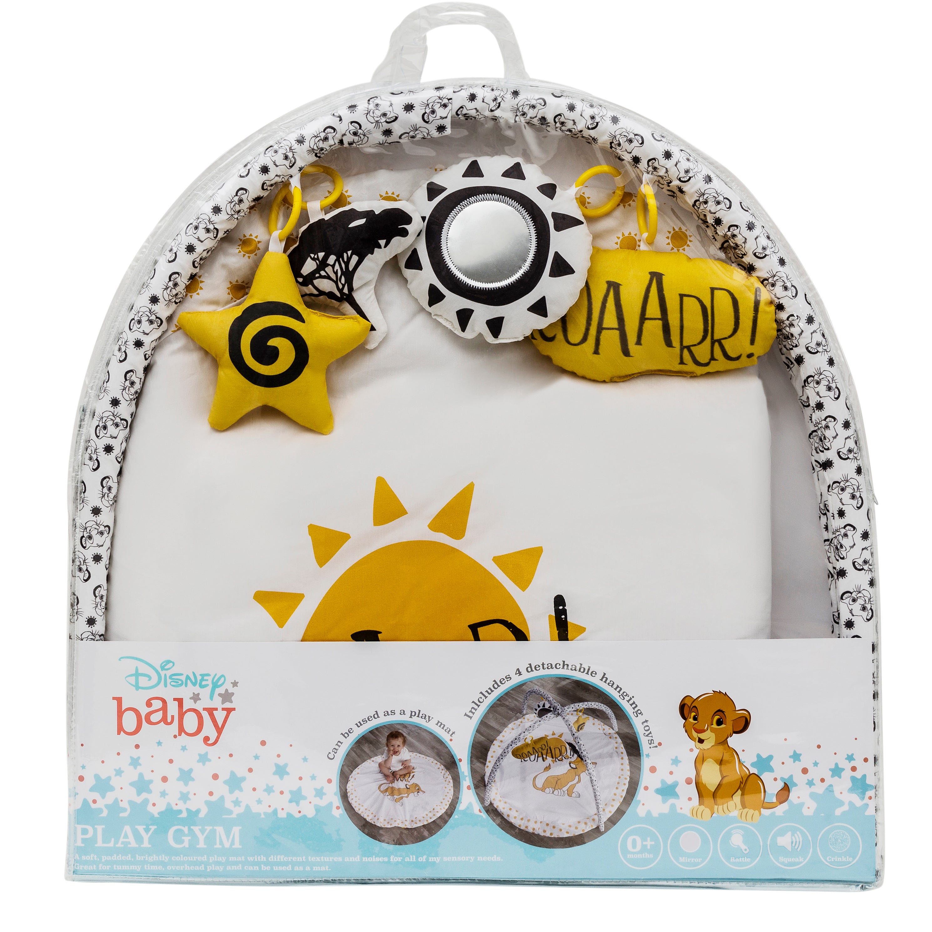 Cute Lion King themed play gym with detachable hanging toys for multi-sensory play. Four hanging toys include a baby-safe mirror, rattle, a squeaky toy and a crinkle texture. Keep your baby entertained with this multi-sensory play gym which grows with them. Remove the foam hangers to use as a play mat.