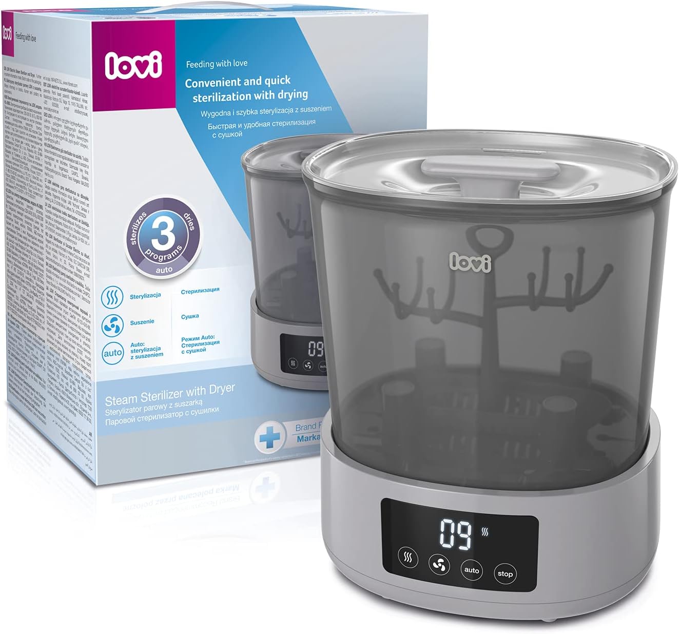 The LOVI Electric Sterilizer with Dryer provides a quick, reliable, and chemical-free way to keep your baby’s bottles, pacifiers, breast pump parts, and accessories hygienically clean. Designed with busy parents in mind, it offers efficient steam sterilization combined with a drying function, all in one compact unit.