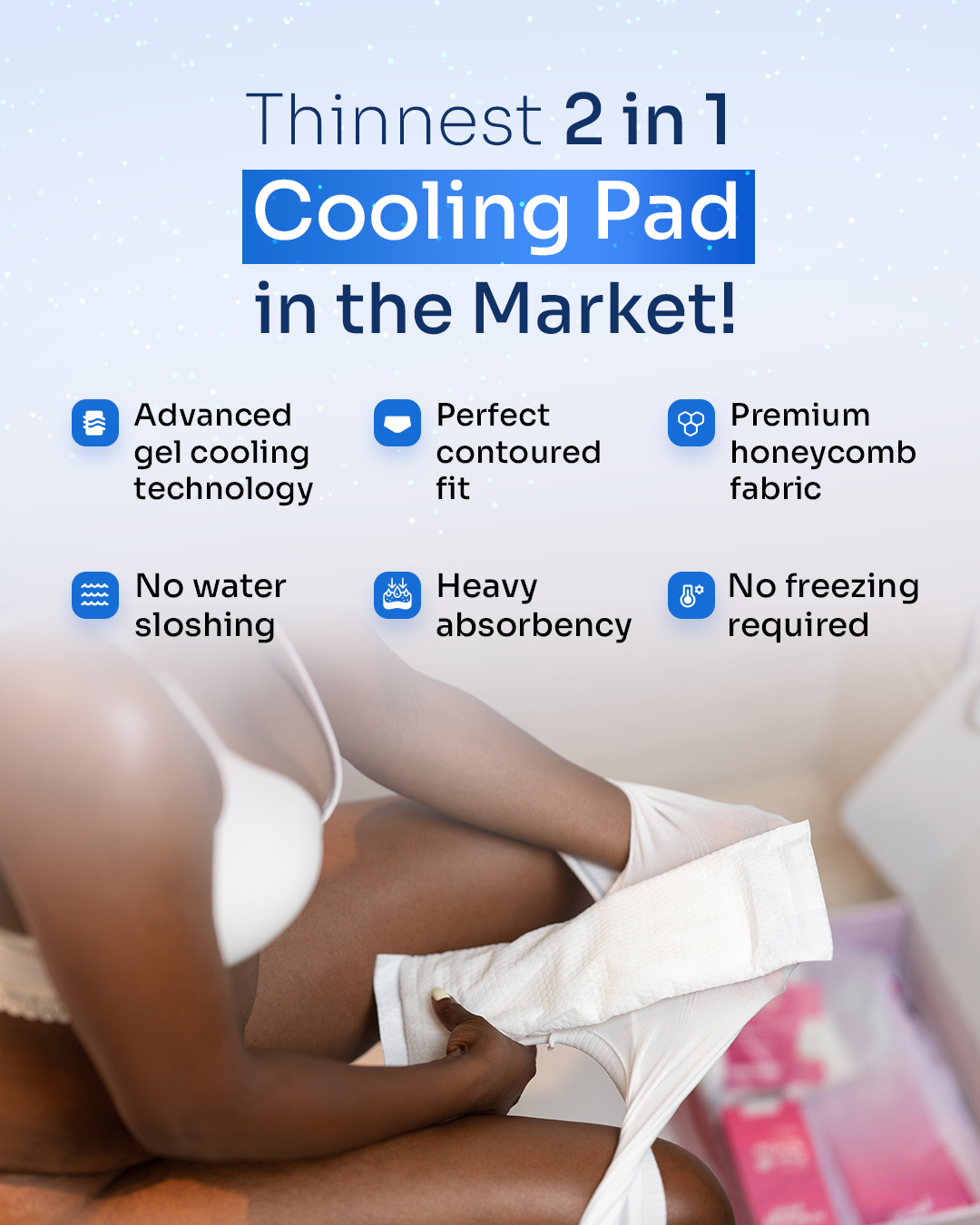 Unlike traditional ice packs, our patented gel-core technology provides superior cooling therapy and high absorbency—without the uncomfortable "water balloon" feel. - Soft, Stretchable Disposable Underwear