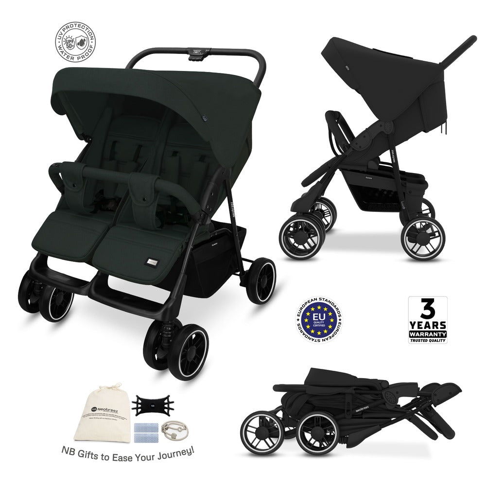 The Neobreez DUADX Double Stroller is a sleek, lightweight twin stroller designed for newborns and toddlers (up to 15 kg each), making outings with two children effortless. Features 3-position reclining seats, adjustable canopies, ergonomic footrests, a secure 5-point harness system, and a peek-a-boo window.