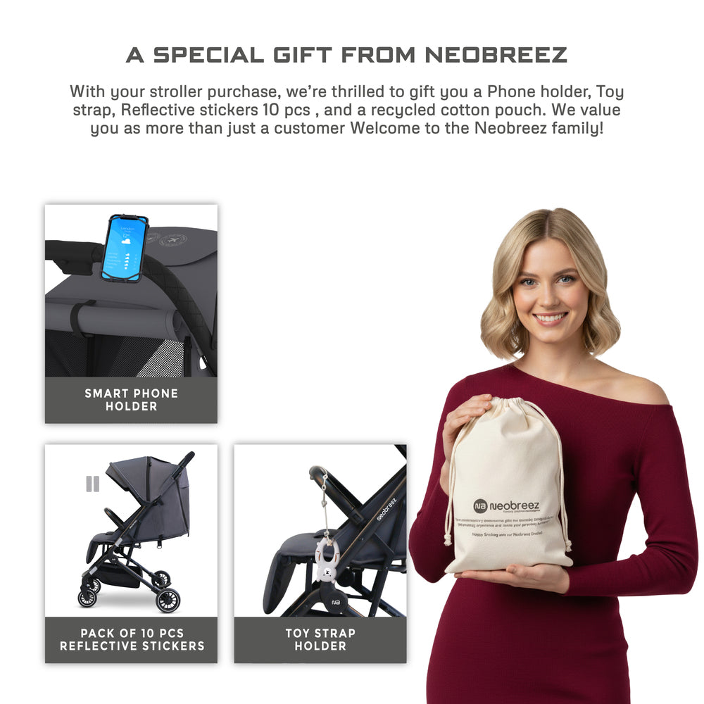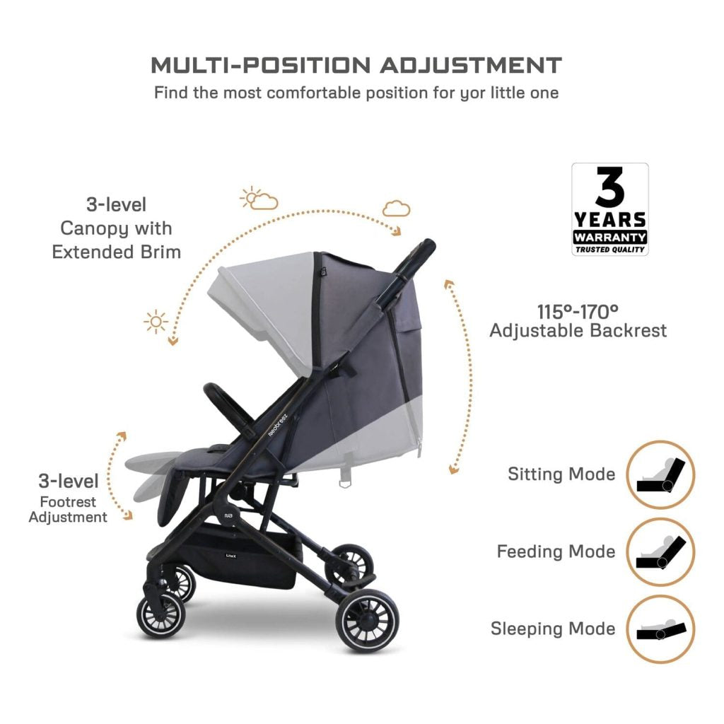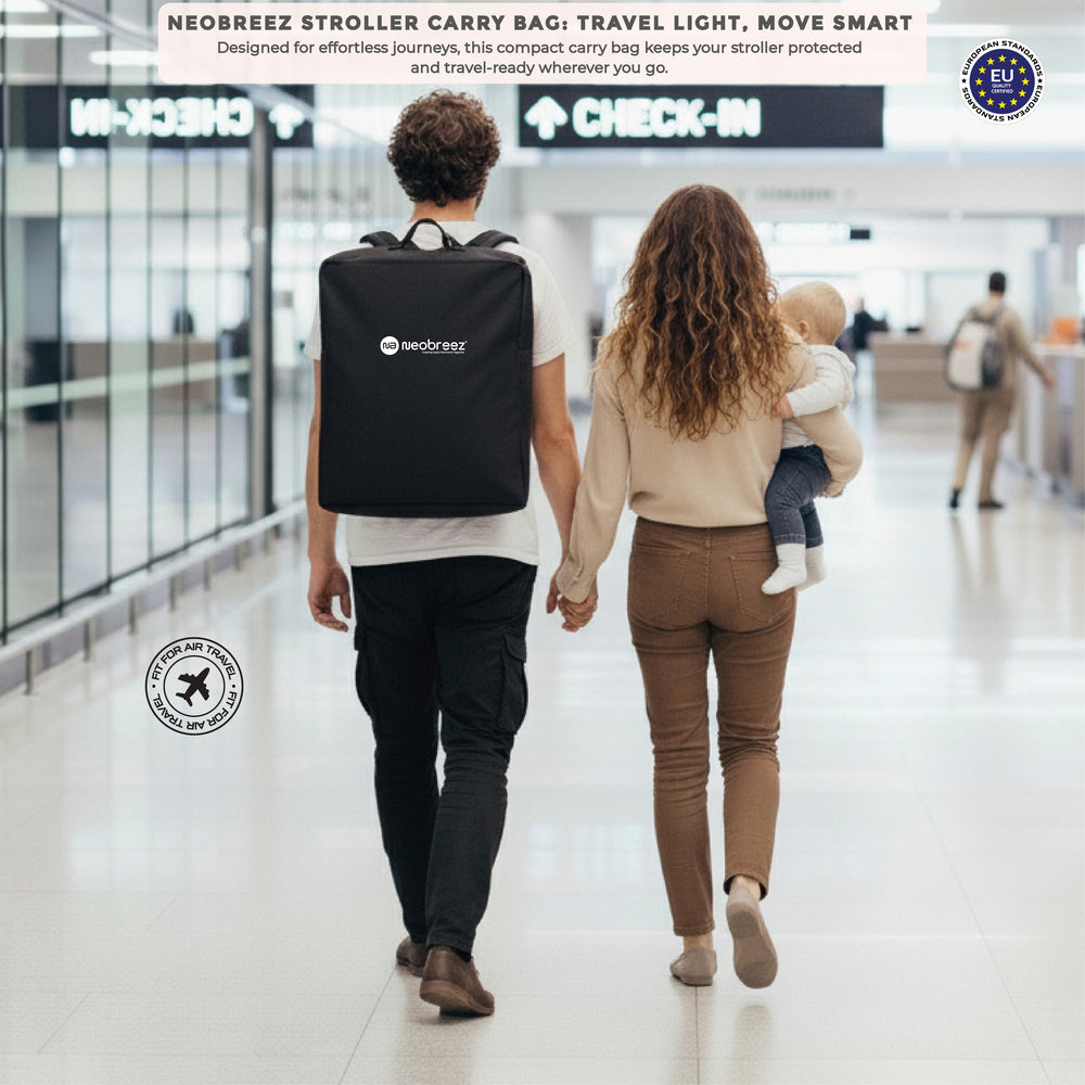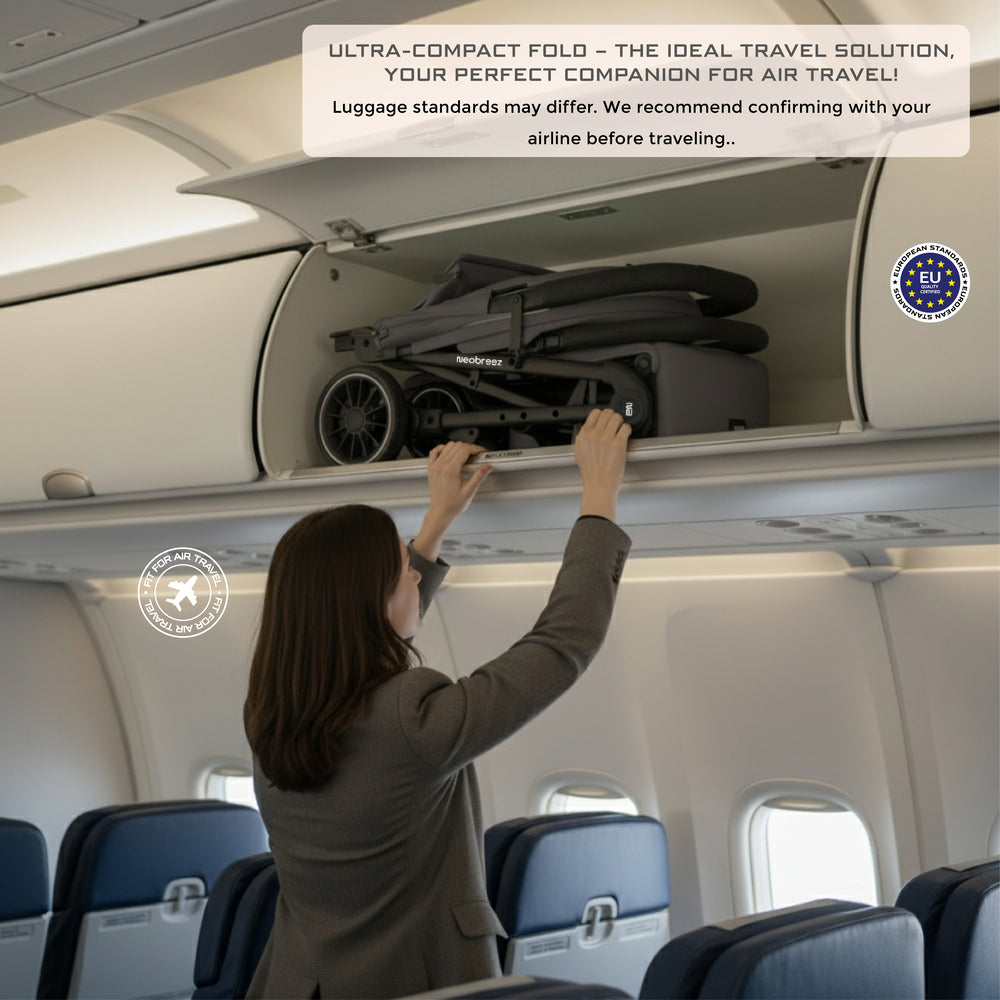 Traveling with your little one is easier than ever with the Neobreez LITEX Air Travel Stroller, designed for parents on the move. This ultra-compact, lightweight stroller is suitable for children from birth to 3 years (up to 15 kg) and is cabin-approved by most airlines, fitting easily into overhead compartments. With its one-hand fold and trolley-style handle, it folds into a self-standing, space-saving shape, perfect for stress-free storage and travel. Your child will enjoy a comfy ride with a spacious seat, adjustable recline, calf support, and soft padded backrest - plus a mesh panel with a zippered cover for breathable comfort in all seasons. Built for smooth navigation, it features all-wheel suspension, 360° front wheels, and a secure one-touch rear brake. The extendable UPF 50+ and waterproof canopy protects from sun and rain, and a peek-a-boo window allows for quick check-ins. Made with durable PU leather, it also offers a roomy storage basket (holds up to 3 kg) and a safety-certified 5-point reflective harness for peace of mind. Every purchase includes a protective travel bag, phone holder, toy strap, reflective stickers, and a gift bag. With style, safety, and convenience combined, the Neobreez LITEX Stroller is the perfect companion for your family adventures.