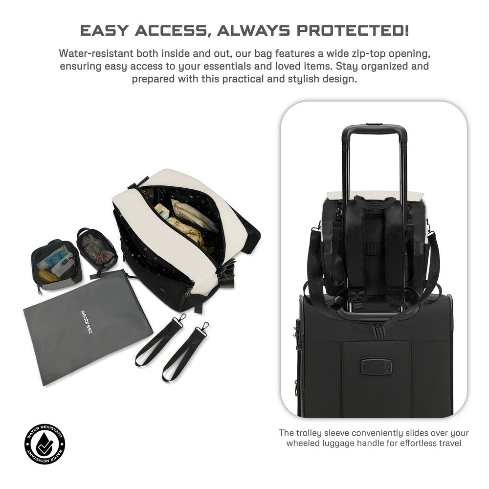 - Secure it to your luggage with the easy trolley link for hassle-free travel. Made from water-resistant fabric with an ergonomic design, it includes a zip-out changing mat, removable pad, and dedicated pockets for diapers and wipes.