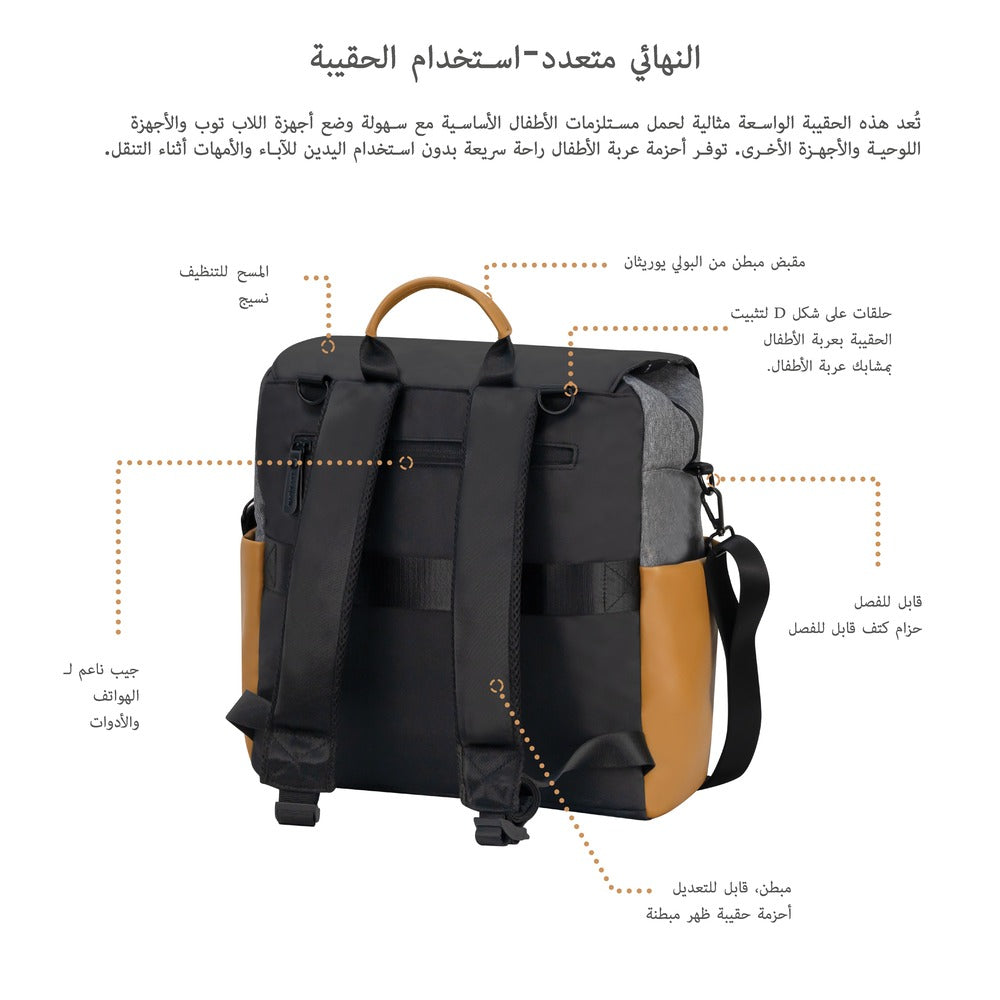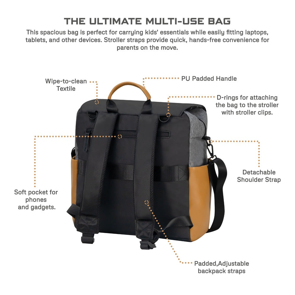 - Bag features premium fabric and PU leather accents, giving you a stylish accessory that works as a tote, messenger bag, or backpack. Its neutral design makes it a practical choice for both moms and dads.