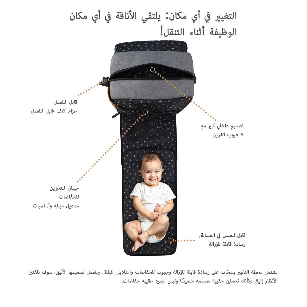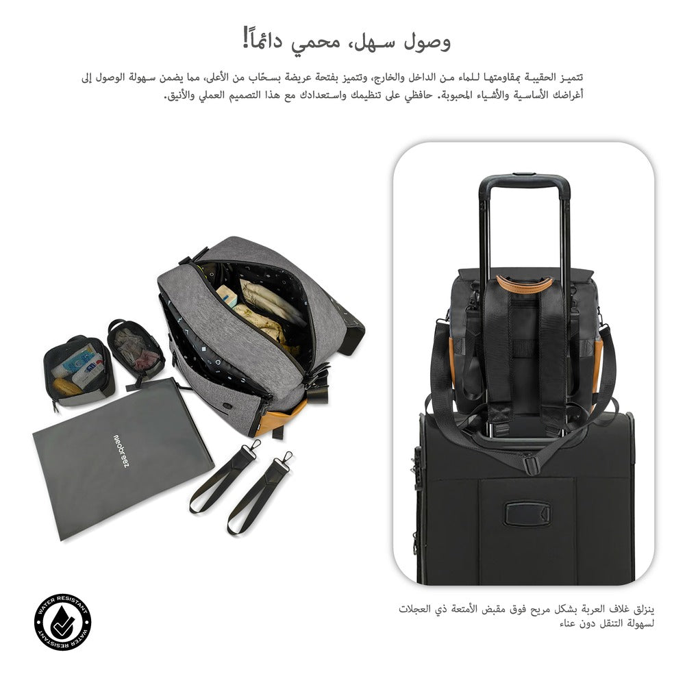 Secure it to your luggage with the easy trolley link for hassle-free travel. Made from water-resistant fabric with an ergonomic design, it includes a zip-out changing mat, removable pad, and dedicated pockets for diapers and wipes.