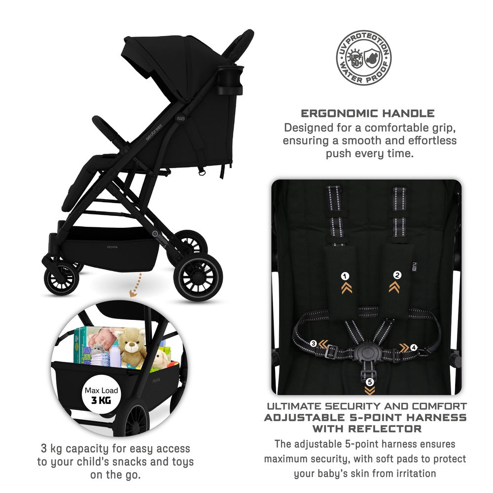 Neobreez Penta Compact Lightweight Travel Stroller with Cup Holder Black