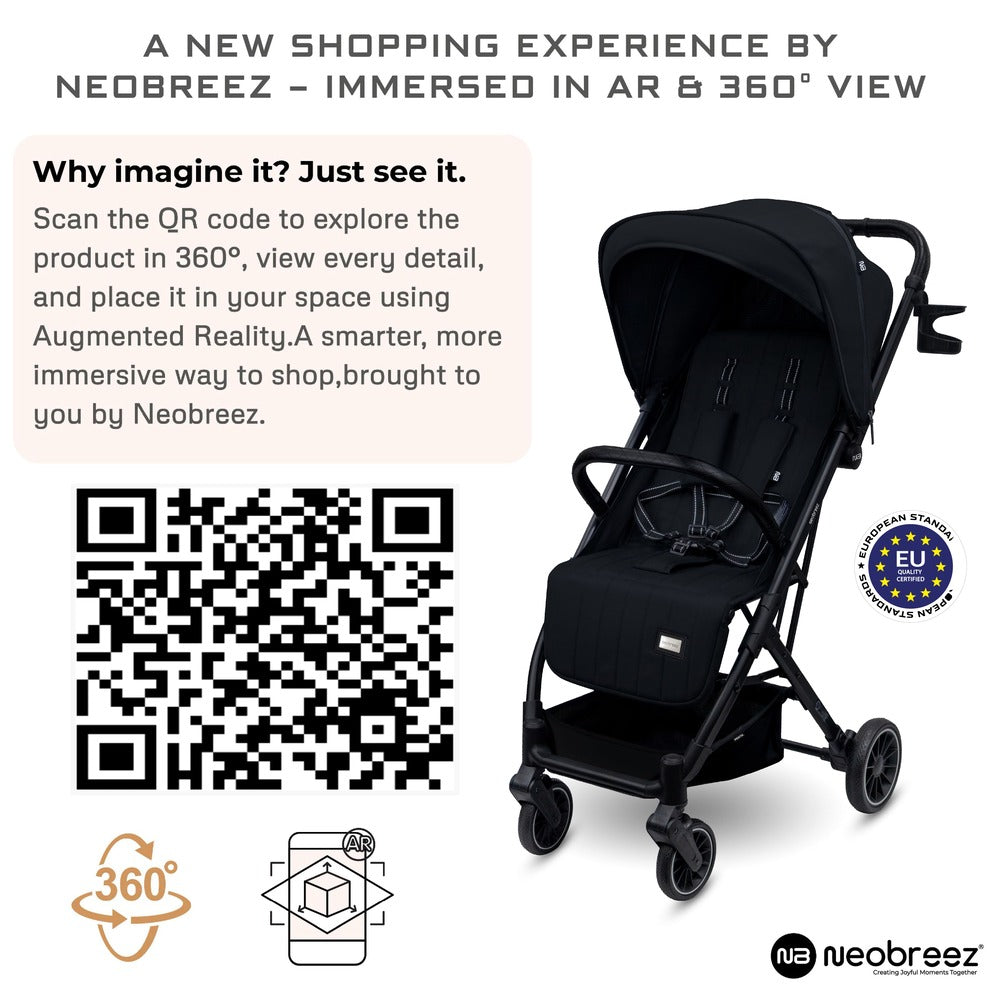 Meet the Neobreez PENTA Travel Stroller Black – your reliable companion for easy and comfortable outings with your child. Designed for babies from birth to 3 years (up to 15 kg), this all-terrain stroller combines comfort, functionality, and modern style. It features a one-hand folding system, compact self-standing design, and a pull-out trolley handle, making storage and travel simple.