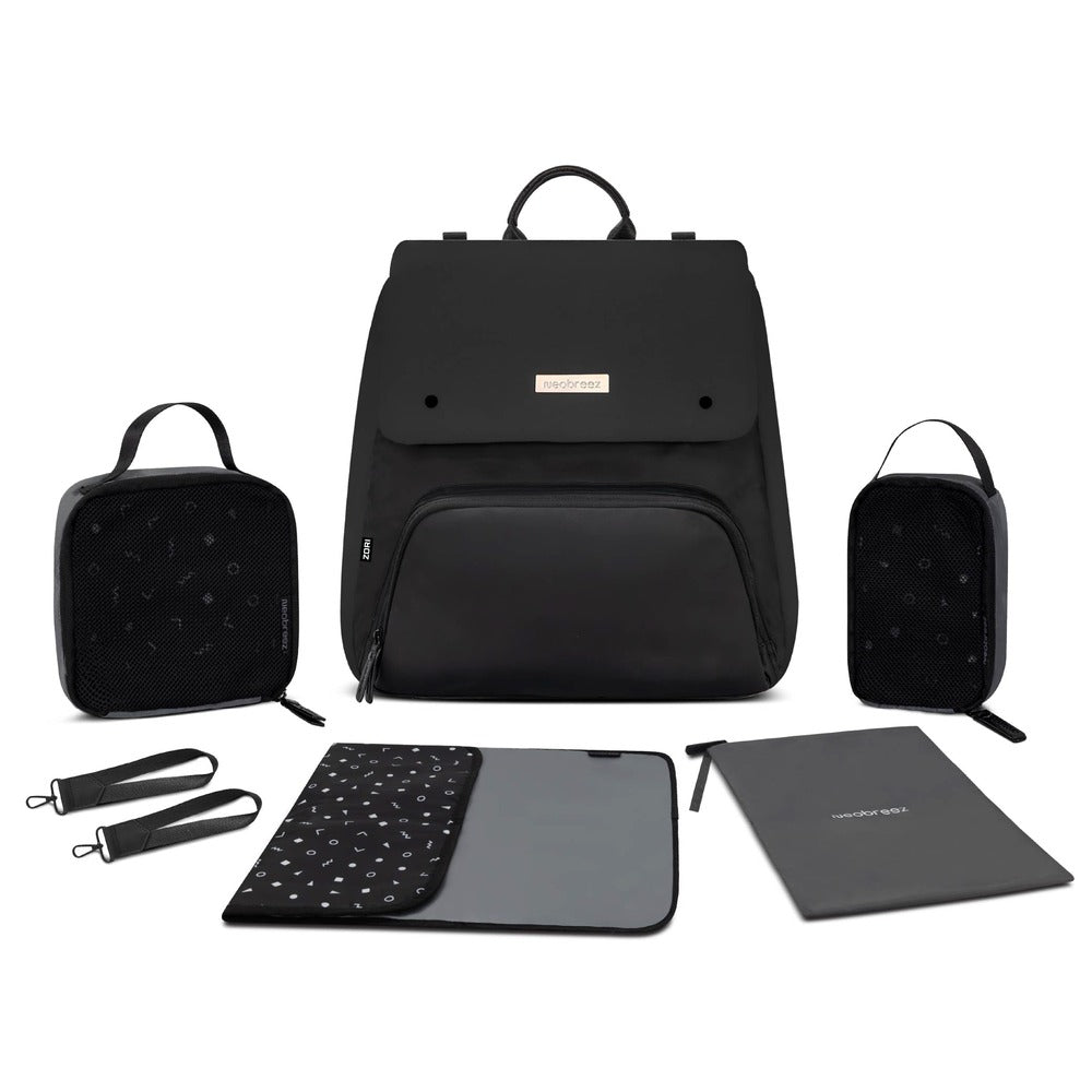 Neobreez Zori Diaper Backpack 7pc Set with Changing Mat Wet Bag and Pouches Black