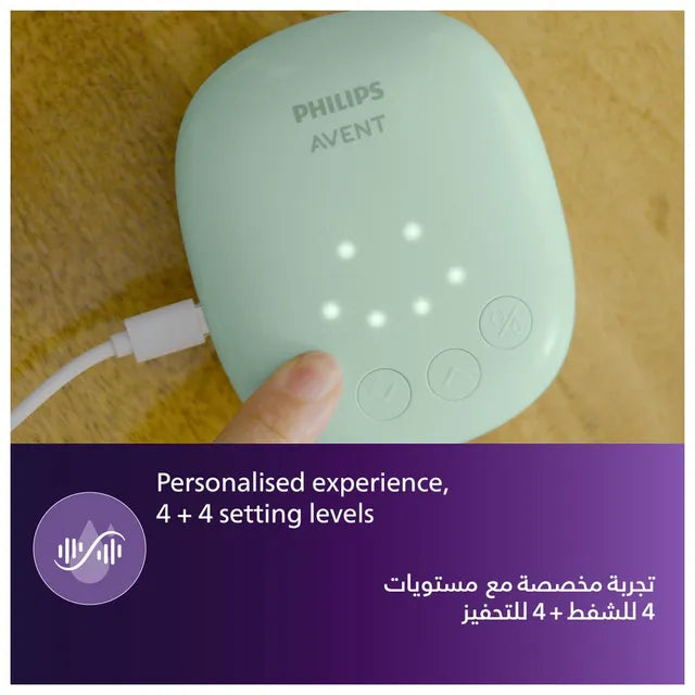 The Philips Avent Essential Single Electric Breast Pump is designed for effortless, comfortable expression, always tailored to your unique needs! This compact, quiet, and easy-to-use pump gently adapts to fit various breast shapes, maintaining optimal milk flow. It's perfect for daily use, whether you're at home or on the go. With 4 stimulation and 4 expression levels, you can customize every session. Plus, the closed system keeps milk out of the tubing, making cleanup a breeze with fewer parts to assemble and clean. Includes: motor unit, silicone tube, USB-C cable, 125ml Natural bottle, expression kit, and screw-on lid.