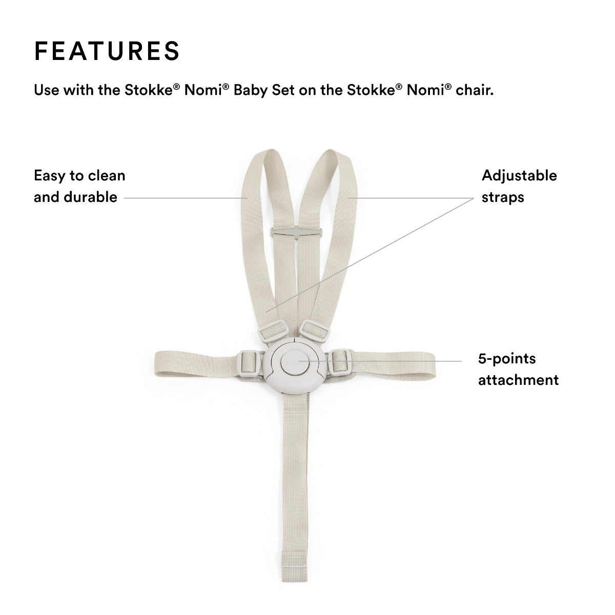 While the Stokke Nomi seating philosophy embraces freedom of movement, we still offer this 5-point harness; Please remember to never leave your child unattended. Our harness is quick & easy to adjust, and the strong, durable material is machine washable. This harness can only be used with the Stokke Nomi Baby Set on the Stokke Nomi Chair.